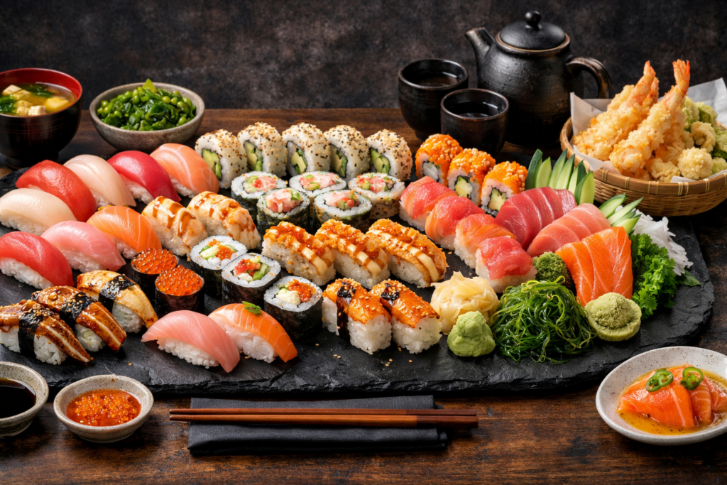 | お祭り5人前セット | いか、とろ、かんぱち、生ほたて、特大赤エビ、玉子焼、いくら、穴子、炙りトロ、炙りとサーモン、いくら、とろたく巻、サーモン | 7,700円 |